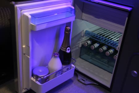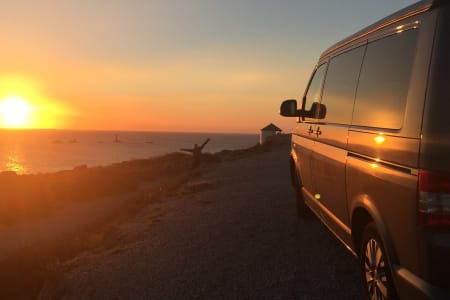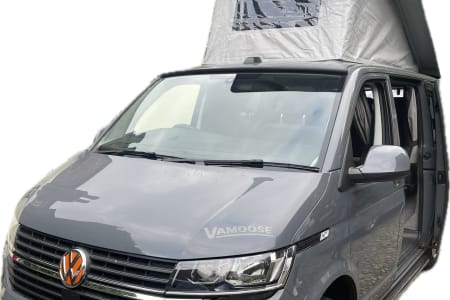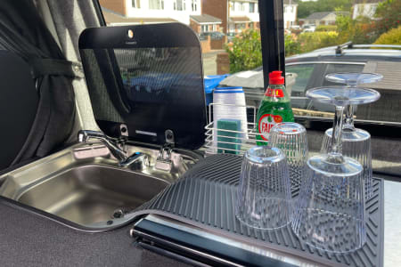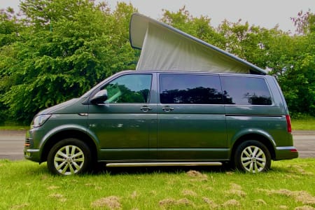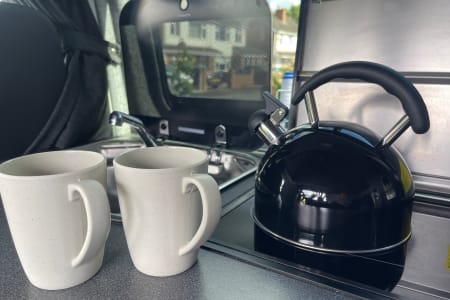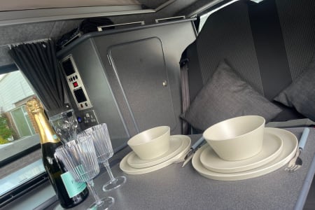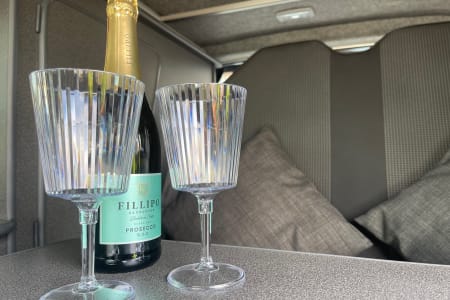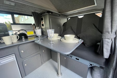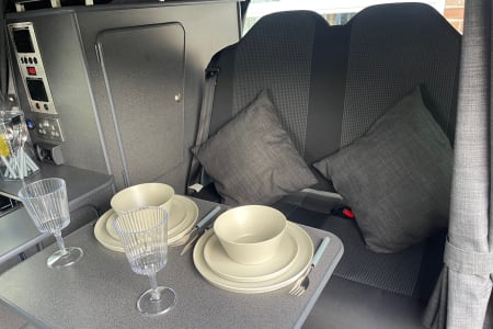 When you've arrived at your perfect spot, the campers sleeps two people on the fold out rear seat, and there’s more bed space in the roof, as well as a bedroom in the optional awning. Both beds are ready in a matter of seconds, and fold away just as quickly. There's a wardrobe and shelves, a fridge freezer, a sink, and a double ceramic hob and heater for the cooler nights. LED lighting is fitted all around the vans which will run off the leisure battery, and there are 12v and 240v sockets so you'll always be able to charge your phone! The front seat swivels round to face the rear, so everyone can sit around the table. For safety there's a fire extinguisher and smoke alarm, and insurance and breakdown cover is included in the price.