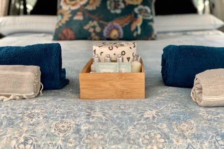 Inside the van is a double bed, crisp and clean linen, feather doona and extra blanket, and mosquitos net curtains. Beach and bath towels are also provided.