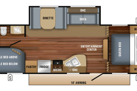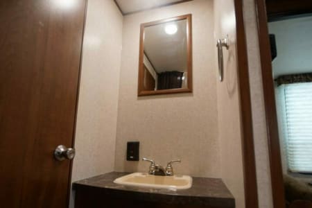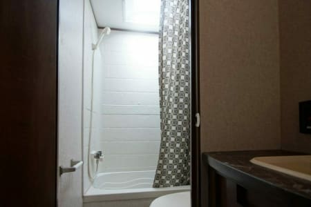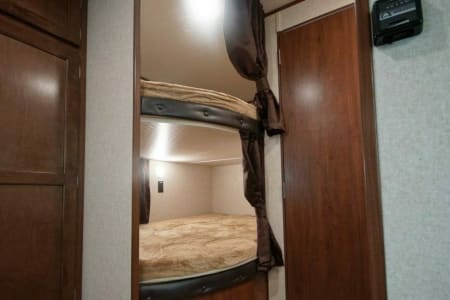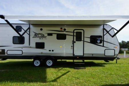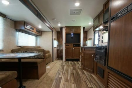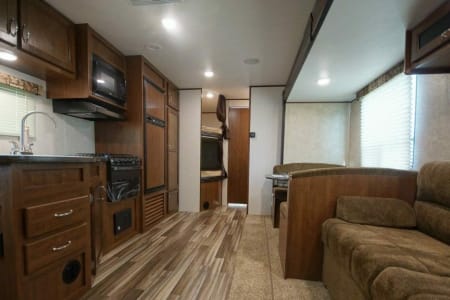 This travel trailer is ready for your next camping trip. The living room is spacious with a Roku 32" TV and Bluetooth radio. About everything you would need in a kitchen is included. Rear bunks are comfy for kids or even adults. The main bedroom has a 24" smart TV to let you relax in bed. Trailer rental will include a anti-sway hitch.