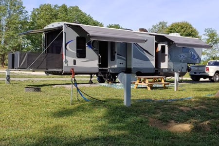 Large, spacious, and well-equipped outdoor party center. 13Ft garage, rear patio deck and screened in the garage, and 3 TVs. 4 beds, 3 queens, and 1 king. Generator equipped. It is a self-contained unit. Water softener and water filter system help with refreshing showers Stainless residential style fridge/ freezer,4 towels, RV toilet paper provided. The RV is stocked with pots, pans, cups, plates, utensils, and a coffee maker for that pick-me-up.