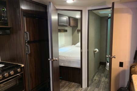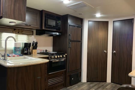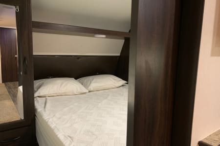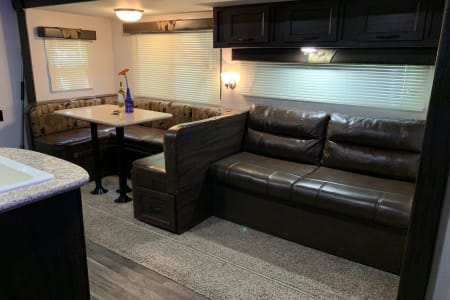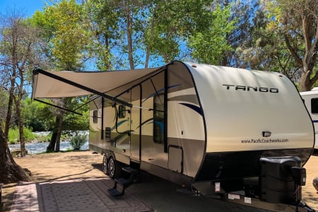 This 32ft 2020 Tango is perfect for your family camping trip. It provides 2 separate bedrooms with doors for privacy, 1 with a queen in the front and the other with a full bed in the rear. With a spacious living room where the couch and dinette convert to beds, there's plenty of room for the whole family. It also has a large corner bathroom with corner shower and separate toilet/vanity. With the electric awning and exterior LED lighting, you can truly enjoy the outdoor living space with your campsite. This vacation trailer can accommodate up to 6 people.
