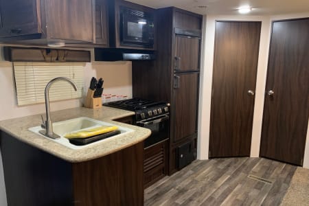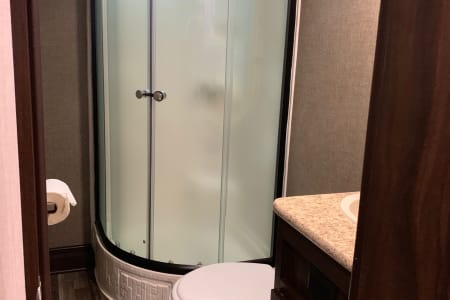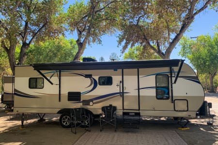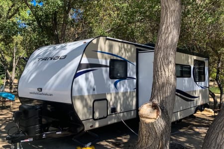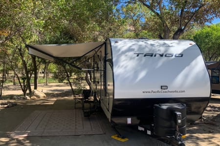 This 32ft 2020 Tango is perfect for your family camping trip. It provides 2 separate bedrooms with doors for privacy, 1 with a queen in the front and the other with a full bed in the rear. With a spacious living room where the couch and dinette convert to beds, there's plenty of room for the whole family. It also has a large corner bathroom with corner shower and separate toilet/vanity. With the electric awning and exterior LED lighting, you can truly enjoy the outdoor living space with your campsite. This vacation trailer can accommodate up to 6 people.