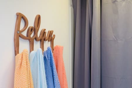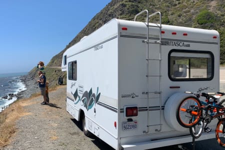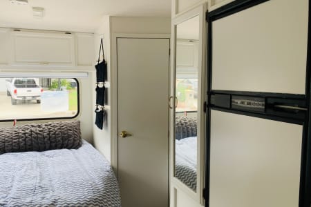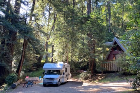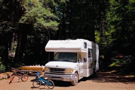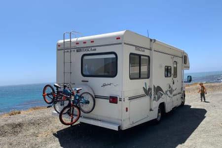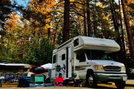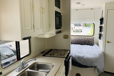 With two queen-size beds, a full kitchen, and bathroom complete with shower stall, this RV brings the comforts of home to the great outdoors. You can start your morning with fresh-brewed coffee and cap off a hike with a cold brew. Come evening, listen to the sounds of crickets and coyotes, or drown them out with the Bluetooth speaker.