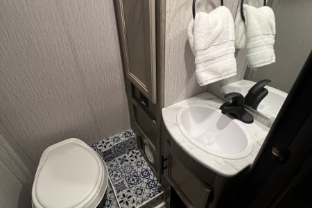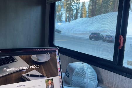 It has a battery bank that charges while you drive (and with the solar panels), plus a 3000 watt inverter (for your 110v appliances), so power will never be an issue no matter how off the grid you go! And talking about off the grid: the propane tank for heating and hot showers is 15 gallons, which goes a LONG way even when is freezing outside.
