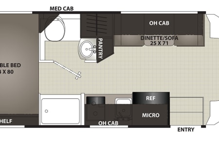Last but not least: the big 3-way fridge (AC/DC/LPG), swiveling driver and passenger seats plus the 4 person dinette make for a great living room for entertaining up to 6 people even when the weather is less than ideal.