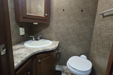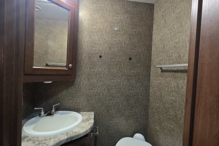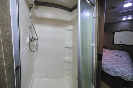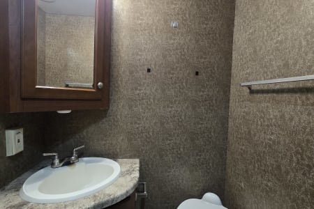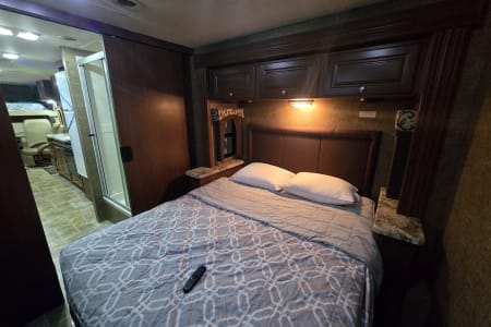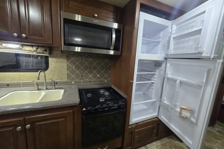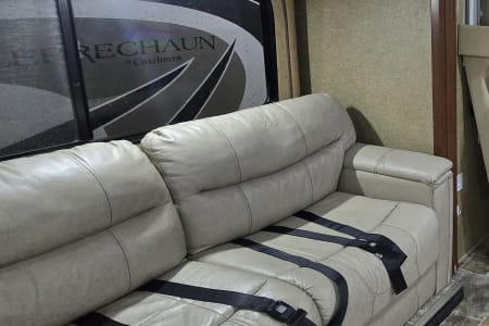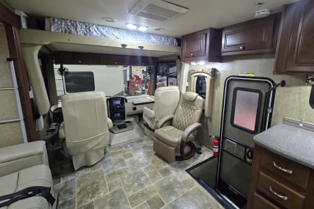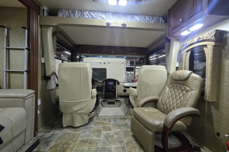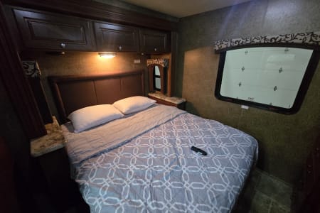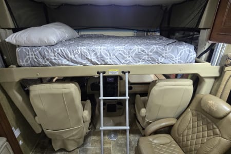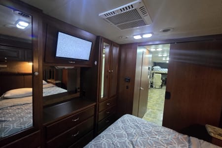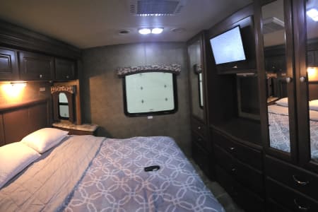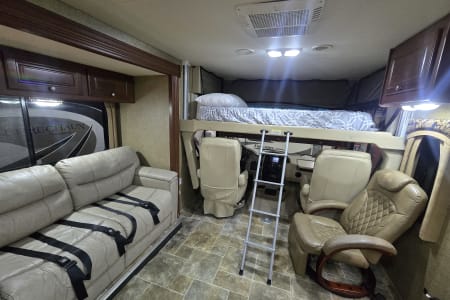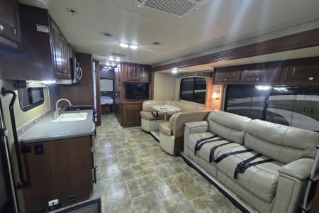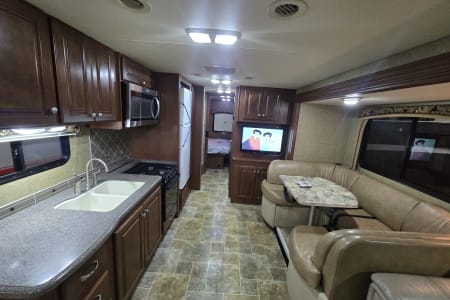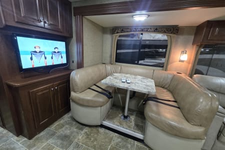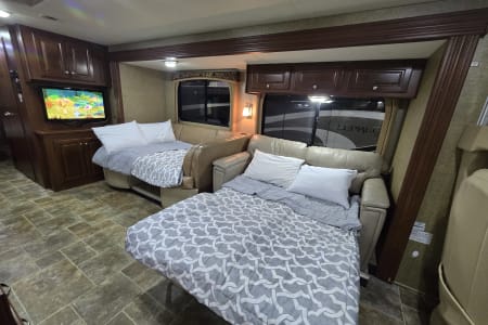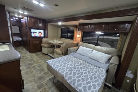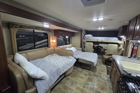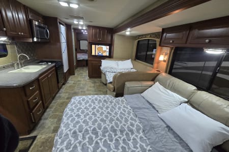 This Class A will sleep up to 8 people with a queen master bed, a double that drops down mechanically above the cockpit, a pull-out bed in the sofa, and the large u-shaped dinette converts to sleep up to 2 people as well. Once the RV is opened up fully, there is even room in the main living area where you could put a queen blowup mattress if you have more people! The kitchen is equipped with a sink, microwave, 3-burner stove, oven, and full-sized automatic refrigerator that runs on both electric and propane, depending on the need. Radio, CD Player, 2 TV's inside, 1 TV outside, and SO MUCH STORAGE!!