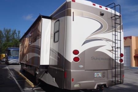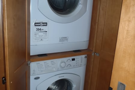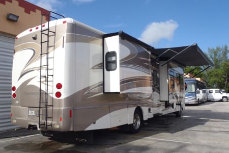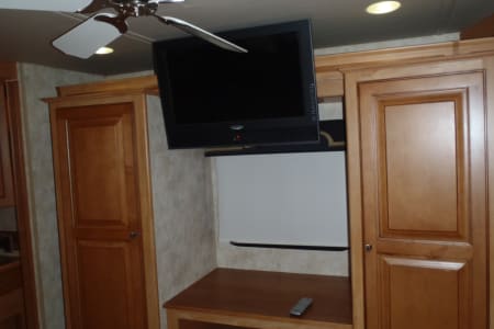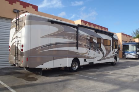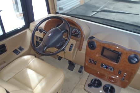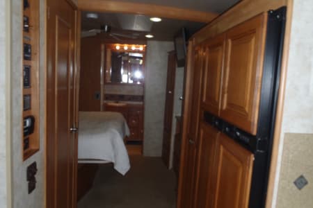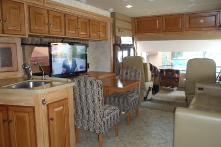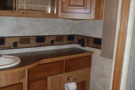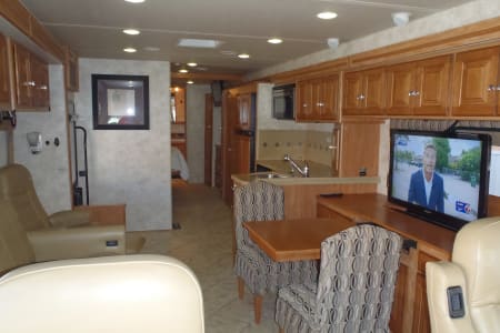 Fully stocked RV ready for your vacation needs. This RV exterior is fully painted in gold with graphics with basement storage throughout and a outdoor TV. Entry door on side with electric steps open to the living room/kitchen area. A large electric awning opens over the entry door at the push of a button. There are 3 slides, One full slide on the drivers side and 2 additional slides on the passenger slide allow for extra space on the interior of the coach. The living room space has an electric leather reclining couch which turns into a bed that sleeps two. Both the driver and passenger seats are electric and recline/swivel to provide 2 additional seats in living area so everyone can watch the large flat screen TV with DVD player in living room. Large Double door refrigerator/freezer, gas stove top, microwave and a double sink makes cooking a breeze. A wide hallway leads past the 1/2 bathroom into the bedroom where you will find a Sleep Number adjustable King size bed, flat screen TV and stereo for relaxing, also master bath with extra large shower. The bedroom also features a large chest of drawers and double closet for storage. There is washer/ dryer combo in the hallway. This fully loaded coach is waiting for you to start your RV adventure Full orientation of RV systems and operation given at time of pickup.