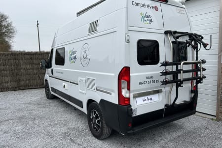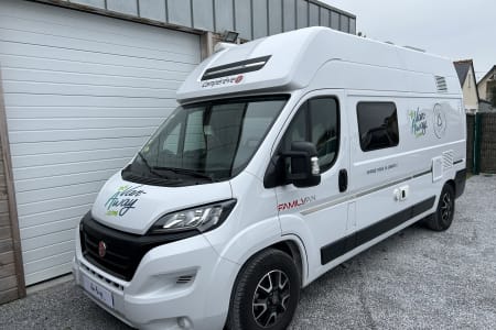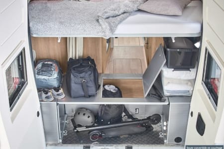Ce fourgon aménagé, petit camping-car, est idéal pour les couples qui recherchent un maximum de confort, ou les familles : en version 5 places (6,00m de long, 3m de haut) avec 2 couchages superposés à l'arrière, un lit double en pavillon, et un lit supplémentaire à l'avant