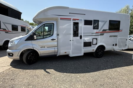 A rear island bed with underbed storage, bedside tables and two wardrobes all closed off by a door give a level of privacy and peacefulness normally only ever dreamed of when away in a hotel. Just in front of this you’ll discover the domestic style shower cubicle separate from the remainder of the bathroom. The popular L-shaped lounge area, creates seating for up to five people during the day, offering a homely space for relaxing and entertaining. Come night-time, a second double bed from the delicate body curves of the Zefiro 696 lowers down above the lounge using a smooth, electric mechanism.