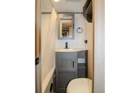 The main living area offers you a comfortable sofa and booth dinette to relax on, fireplace, and TV, so you can watch a show while you relax. The kitchen is equipped with a spacious fridge & freezer, three-burner range with air-fryer oven, microwave, and stainless steel farm sink.