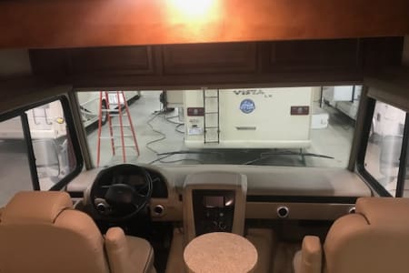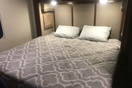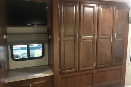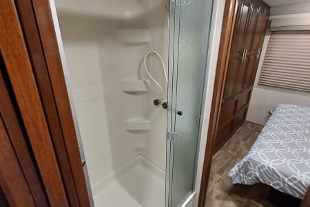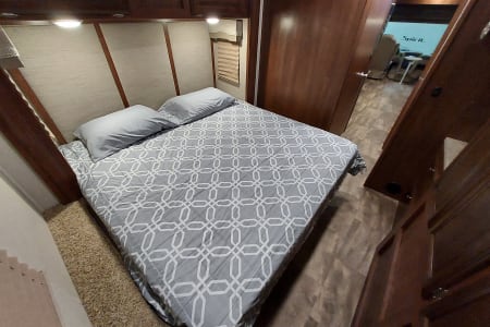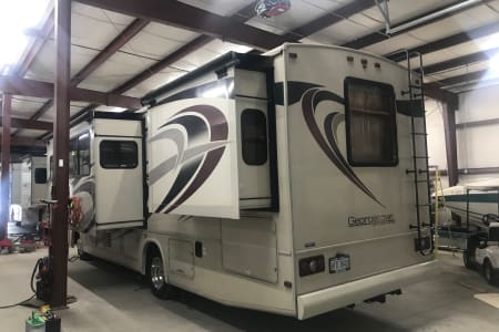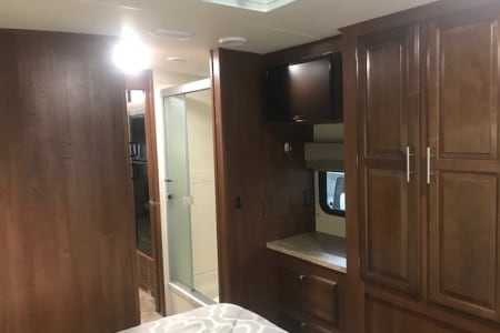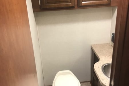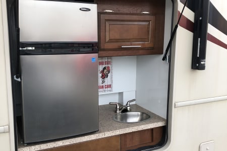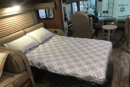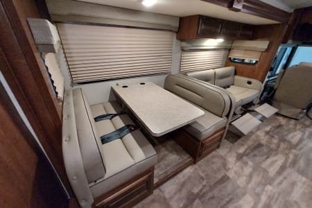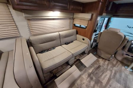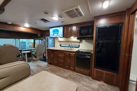 This is a great Class A for a smaller or medium-sized group and sleeps up up to 8 people with a king master bed, a double hide-a-bed in the sofa, a twin bed that drops down above the cockpit, and the large u-shaped dinette that converts to sleep two. The kitchen is set up with a sink, microwave, mid-sized electric fridge, oven, and 3-burner stove. The sofa and dinette are both on the same side of the living area together directly across from the kitchen, so when you are parked and you open the living area slide-out, you have a nice open area with plenty of room to move and live in your home away from home. To make it even better, there is also an outdoor kitchen area as well!
