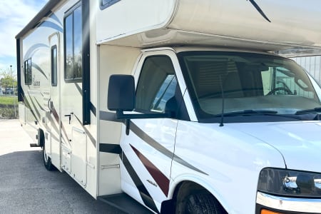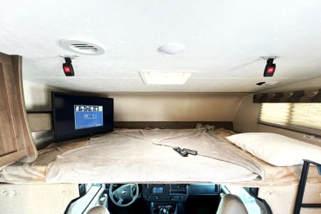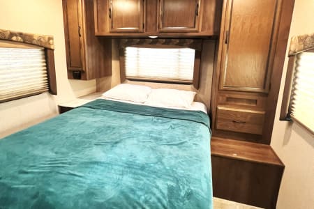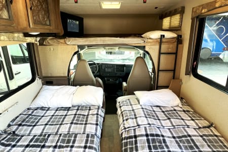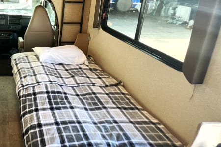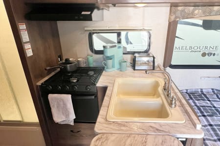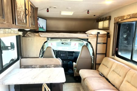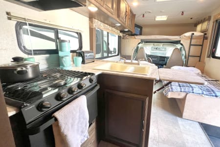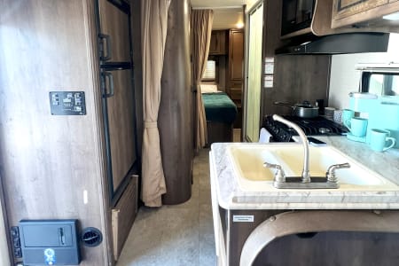This is a great unit for just a couple or a small family. Rated to sleep *up to* 8 people, there is a queen master, a double loft bed above the cockpit, and both the dinette and sofa convert to sleep up to 2 people each, depending on size. The kitchen is equipped with sink, microwave, oven, 3-burner stove, mid-sized automatic fridge that stays running by automatically using either electric or propane depending on whether you are plugged in or not. This is also a great size RV if you are just starting out and want to make sure you are comfortable maneuvering before moving up to something bigger!