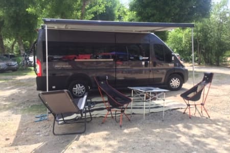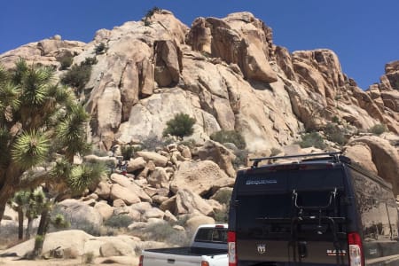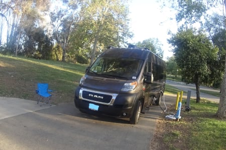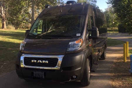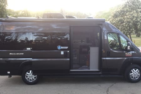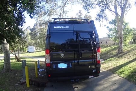 The chassis is a Dodge RAM ProMaster 3500 Window Van, 280HP, 260 lb.-ft. Torque, Bike Rack on Rear Door included. Single Door 12V Refrigerator. Two Burner Gas Cooktop, Convection Microwave Oven. 190 W Solar with 2 AGM batteries.