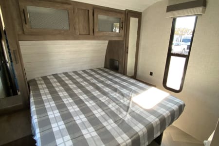 Enjoy a new adventure with family and friends in our brand new Wildwood travel trailer! Open living space with PLENTY of sleeping room - up to 10! Both the dinette and the sofa open into beds, while the bunk house has 2 bunks and a queen sized bed with its own AC unit. Great for a second family (or the in-laws). The master bedroom has a full length queen-sized bed as well. Fresh linens provided for the queen sized beds and bunks. 40 inch Smart TV, Bluetooth stereo, and fireplace add to the at-home family experience. Bathroom has an upgraded Oxygenics shower head, bath towels for 6, and RV toilet paper. 4 camp chairs, outdoor gas grill and refrigerator, along with the outdoor speakers will keep you entertained well into the night. Kitchen is stocked with a Keurig, cookware, utensils, paper goods and cleaning items. We also provide a propane fire pit to keep you warm when the weather dictates.