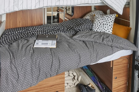 La chambre, vous permet de partir à trois ou quatre, mais sans convertir au quotidien la dînette grâce à ses deux grands lits superposés à l’arrière. Amovibles et individuels, les sommiers du lit haut laissent une grande liberté dans l’organisation de la chambre. Sous le lit, une soute vous permettra de stocker tout le nécessaire et d’accéder facilement au compartiment gaz et au réservoir d’eau propre.