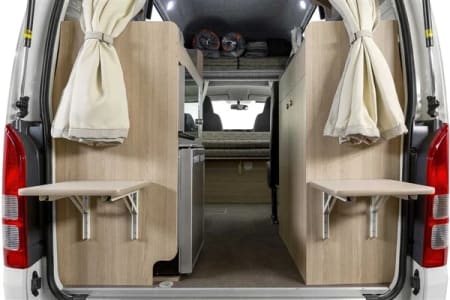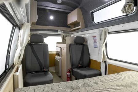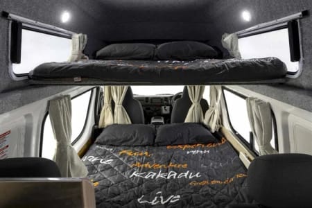 This van has enough seats for 3 people and room to sleep 3 in a bunk bed set up, in the back, there is a double bench seat that converts to a bed in 1 minute, a dining table, a 60l built-in fridge, 45-liter water tank hidden out of the way, and a kitchen sink with running water, the van is powered by a dual battery system that is isolated so the main/starter battery will never go flat.