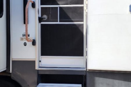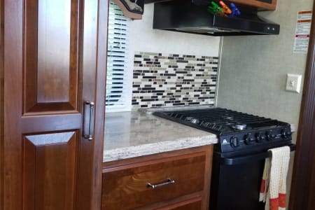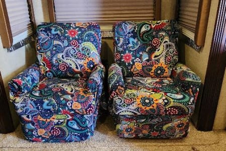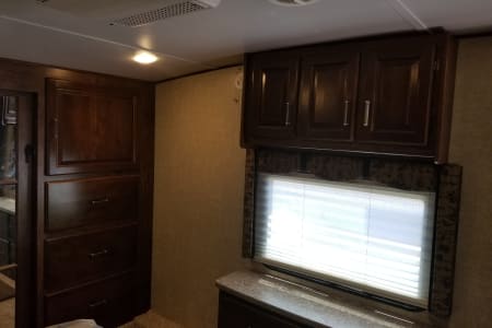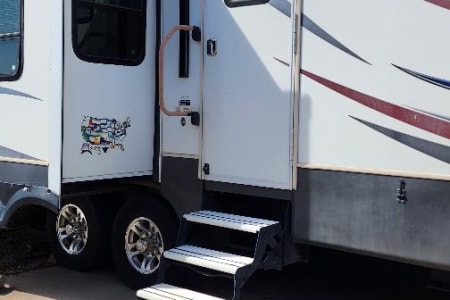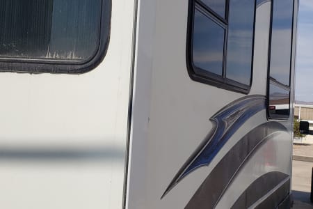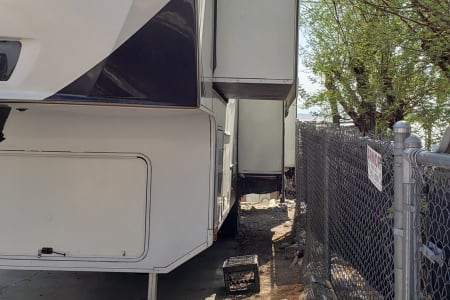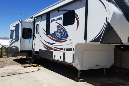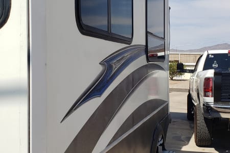 Well maintained 5th wheel perfect for a quick weekend getaway or for a long vacation. 4 slide outs including a PRIVATE BEDROOM, QUEEN bed with UPGRADED MATTRESS and lot's of closet and drawer space plus a FLAT SCREEN TV IN THE BEDROOM. There is a QUEEN SIZE HIDE A BED couch in the living room with a SELF INFLATING/DEFLATING AIR MATTRESS along with two leather recliners, an Electric FIREPLACE and LARGE FLAT SCREEN TV IN LIVING ROOM. TV is cable ready and there is a DVD player with surround sound and lots of DVD's (rated PG - R). AM/FM radio with CD player with indoor and outdoor speakers. Full kitchen complete with Refrigerator, Freezer, Stove, Microwave, complete set of dishes (4 place settings) , cookware, toaster, coffee pot, crock pot and utensils TWO ROOF TOP AIR CONDITIONERS plus electric exhaust fan in kitchen. Stereo system with outdoor speakers. Also provided for your outside comfort and at no additional cost are lawn chairs and a 6 ft. folding table. We deliver and pick up ONLY to campsites in Mohave County and Pirates Cove RV resort and Needles Marina and some RV parks in Parker that offer FULL HOOK UPS INCLUDING 50 AMP SERVICE and SEWER. DRY CAMPING IS NOT ALLOWED. Nominal Fee for delivery outside of Lake Havasu City. Prices are negotiable for long term rentals. 2 day rentals may be available but at a per night rental fee of $160. Due to frequent and unexpected wind conditions NO AWNING is provided but feel free to bring your own easy up.