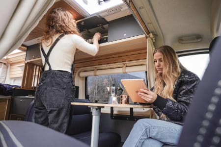 Conçu pour faire voyager 2 personnes, ce van est équipé d’une chambre au rez-de-chaussée. Petit nid sur roues dont le toit en verre panoramique ouvre directement sur le ciel, ce van a été conçu pour vivre l’aventure en vans à deux. Rien qu’à deux. Tout est permis.