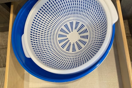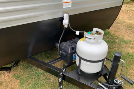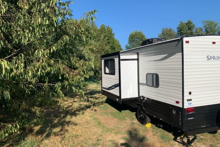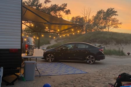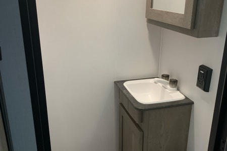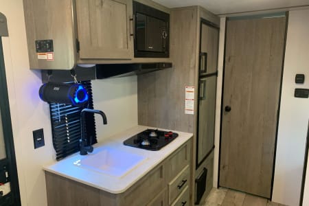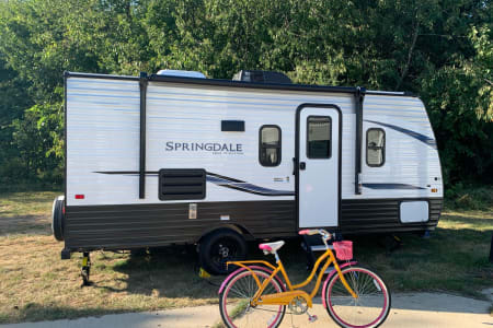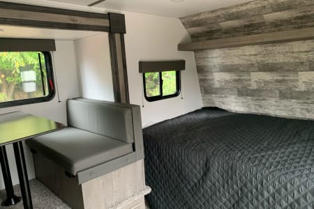 Don’t let this small bunk house fool you! It has a slide out dinette, which makes for lots of space and the fridge is nice and big so you don’t have to mess with coolers.