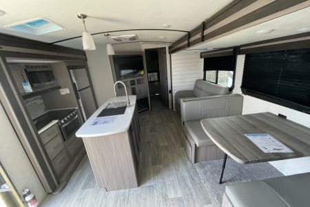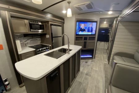 Gas Stove, microwave, fairly large fridge/freezer for a travel trailer and tons of storage to hold everything you need for your trip. Outdoor kitchen includes a gas grill, refrigerator, sink and additional storage. Rollout canopy, LED exterior lights. This trailer provides it all!