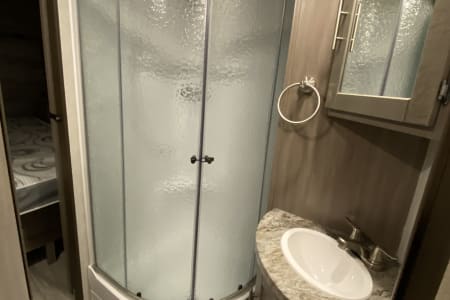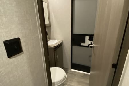 There are 2 entry doors, one opens into the main living/kitchen area, the other opens into the second private half bathroom. Perfect for when you are enjoying the outdoors and only need to use the restroom with outdoor access. There are two toilets on this trailer and the other is connected to master bedroom with a King bed. (Has door into restroom and pocket door into king bedroom for full privacy). Lots of storage for hang up clothes and a stand up shower.
