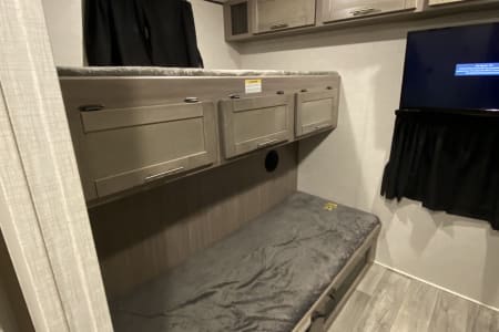 2021 Crossroads Sunset Trail- This is a great multi purpose trailer and gives lots of privacy to all guests. Can sleep 11-12, or 10 comfortably. King Bed, Kitchen Dinette, 2 fold out couches into full beds and 3 twin bunks.