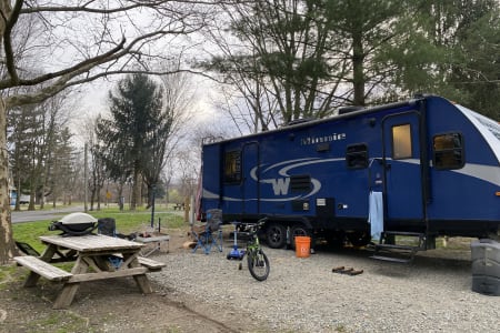 Freshly renovated Winnebago Minnie is large enough to have everything you need but small enough to still tow without a serious truck. Kitchen and living area is separate from the bedroom so you don’t constantly have to stow away a bed. Dinette slide out provides plenty of living space and a great “WFH office”.