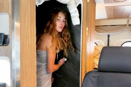 SALLE DE BAIN : Imaginée en feuille de pierre naturelle, la douche du van ØBERWILD offre un cadre idéal pour une mise en beauté, et la présence d’un échangeur à plaque à bord garantie l’eau chaude en permanence. Touche luxe : les draps de bain et les produits de beauté sont fournis. Respect de l’environnement oblige : pour éviter les gaspillages d’eau, une toilette sèche est installée sur un tiroir coulissant dans la douche.