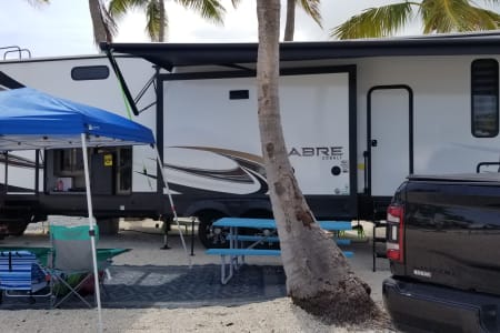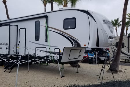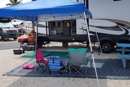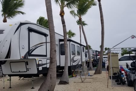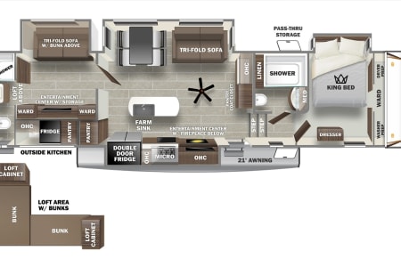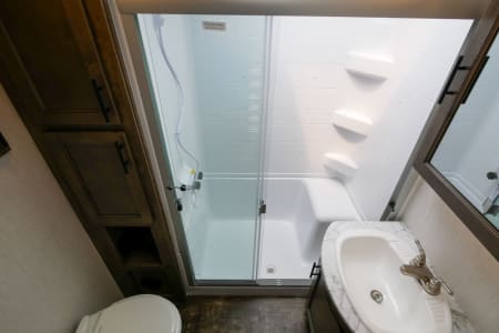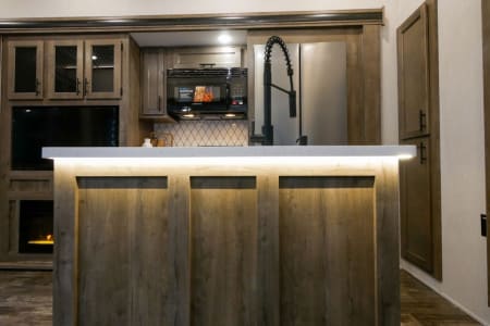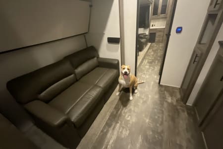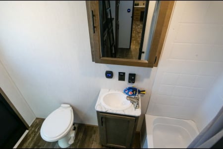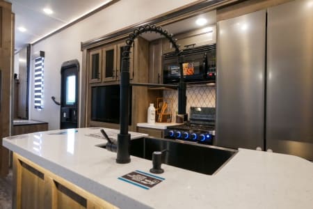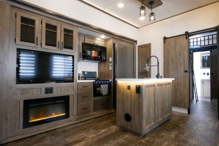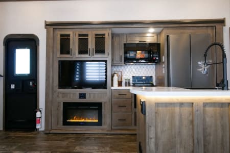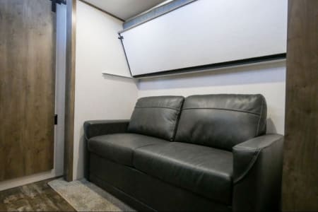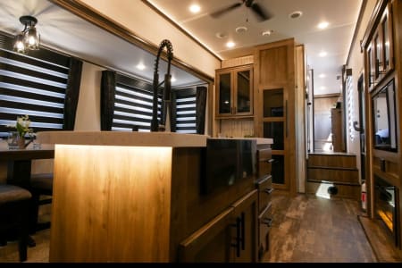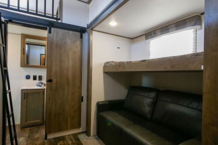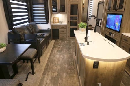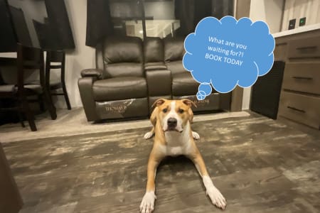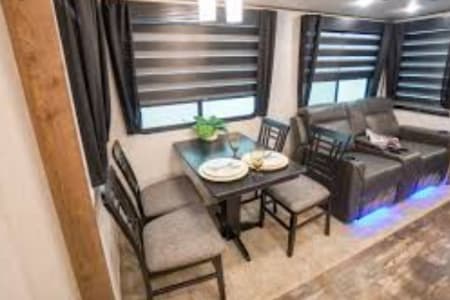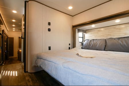 This large RV feels like home on the road. It comfortably fits a large group as it has a king bed in the master bedroom and has a bunkroom with 2 loft beds, a bunk, and a pull out couch plus 2 recliners in the living room. There are 2 full bathrooms. Washer and dryer are located in the master suite closet. There's lots of storage space in the bedrooms, kitchen and "basement". This bad baby has comfortably traveled cross country with a family of 5 for nearly a year during the pandemic, including for remote learning and remote working. Fully loaded with laundry, fridge, stove, microwave with convection oven function, indoor/ outdoor radio, tvs, and much more! There's even an outdoor kitchen with a sink and lots of cabinet space for grilling or electric cooking. There's also an outdoor shower which makes cleaning up outside a breeze. Note that we will make best efforts to ensure all items are functioning. However given that items can fail or may return from another reservation damaged, we make no guarantee of their availability, especially during busy seasons where there is limited maintenance time for repair. We will inform you if something material (ie, we believe there is a chance it may impact the usability of the RV) may not be working prior to pick-up/delivery. Please note that it is normal for the unit to have debris, dirt and small wood chips after moving the RV and moving the slide outs. Additionally, while RVs are usually viewed as a home away from home, please note that these units on average tend to retain dirt more than traditional homes, including as a result of workers and renters walking in and out of the RV with shoes and renters choosing whether they want free or paid cleaning options.