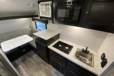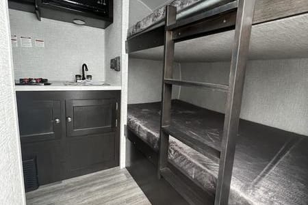 On the interior, Braxton makes excellent use of the space by having an expanded "wet bath" with an integrated shower/toilet enclosure, double burner stove, 3-way fridge, microwave, radio, and a four-person dinette that turns into a queen-sized bed. There are also two bunk beds that are a little bigger than a twin-size bed. Braxton is equipped with a 24-gallon freshwater tank (comes empty), a 17-gallon black water tank, and an 18-gallon grey water tank, which make it great for both off-grid camping and full hook-up camping.