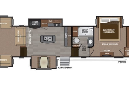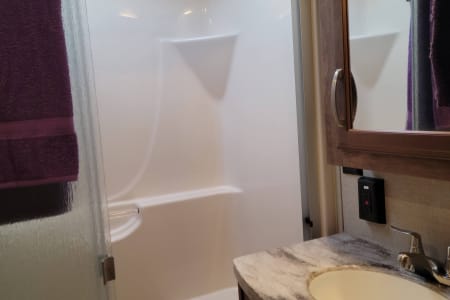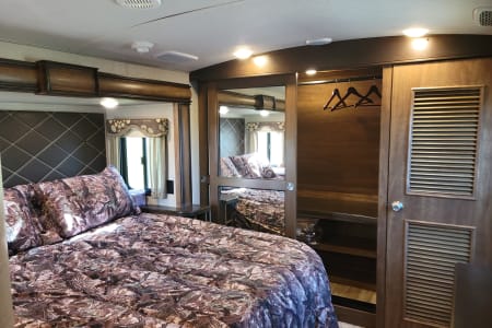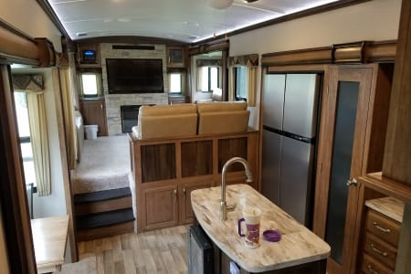 Do you want to be near nature, but have a more luxurious camping experience. This spacious fifth wheel is for you. With 5 slide outs, it gives you lots of room. There is a large fridge perfect for longer excursions. The island gives you plenty of space to prepare food along with a ton of kitchen storage (including a pantry)