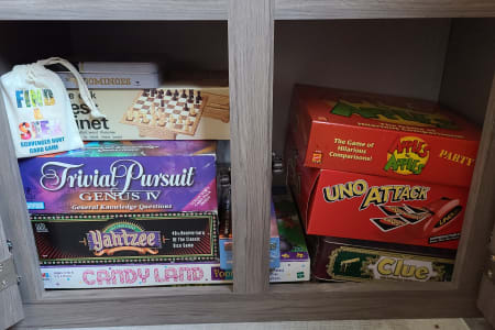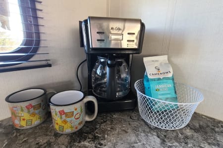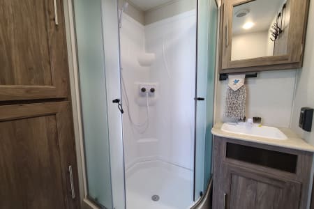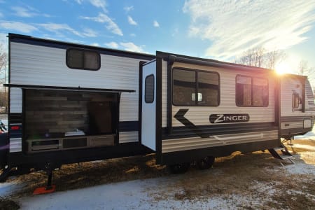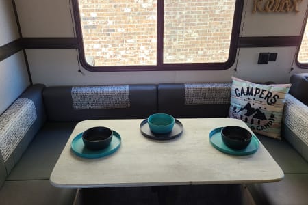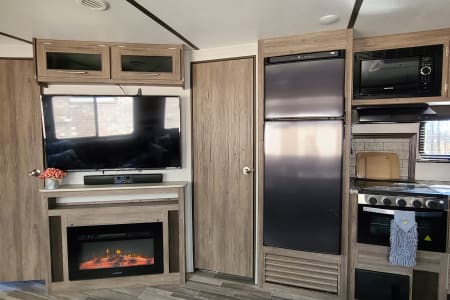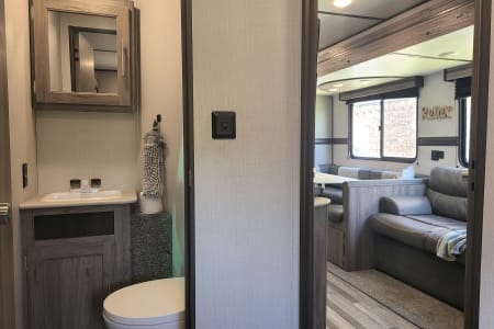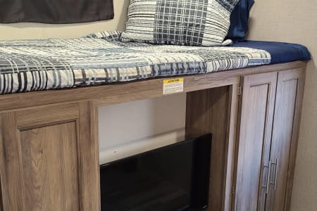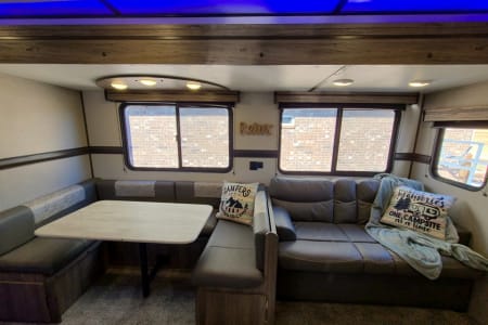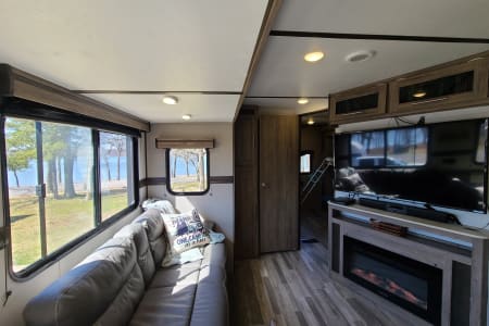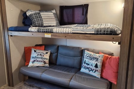 Meet Annie! Annie is an extension of our family and designed for comfort when she travels. Annie is perfect for your family vacation and comfortably sleeps 5-7 with a Master bedroom (Queen Bed with 8 inch gel mattress and pillow top) and a large bunk room. The bunk room gives your kids (or family #2) their own private space with two bunks, a large sofa that will pull into a bed, television, DVD player...and wait for it...it's own half bath! The living area consists of a love seat (will fold out to a small bed), 49" television, DVD, fireplace, stereo, U-shaped dinette, and fully equipped kitchen. Our kiddos also love to share their favorite board games with your family and we always have crossword and puzzle books on hand to enjoy with your morning coffee along with a collection of movies for those rainy afternoons.