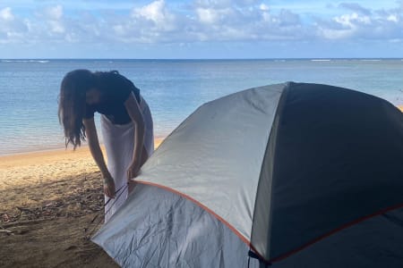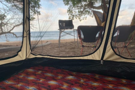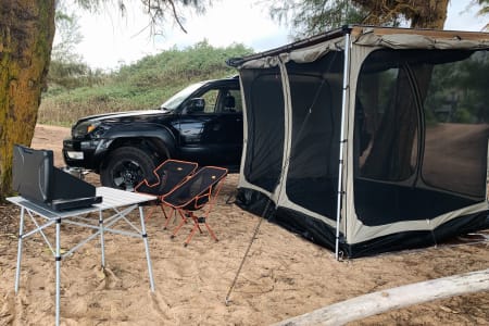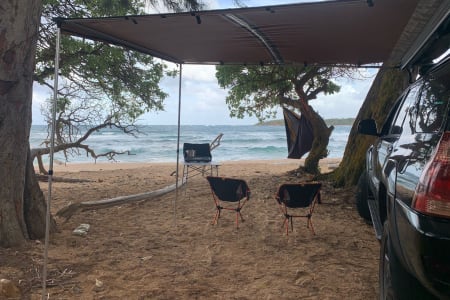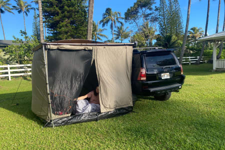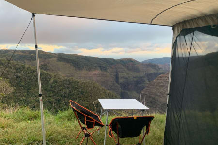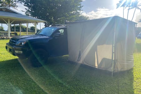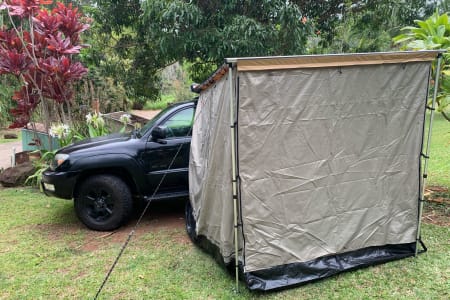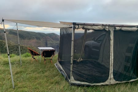 The awning itself sets up in about 5 min and provides perfect shelter from the elements for a picnic, snack or bevy. The heavy duty awning bedroom is rugged, waterproof and sets up in about 10 min. It can function as your tent, bedroom, dining room, nap area, reading nook, change room or whatever else you can think of. The room is 8'6' and can accommodate up to a small family or three people easily for sleeping. Included in the rental is a free Kaua'i guide containing map links and reservations links to all the camping on the island as well as key points of interest and local food options!