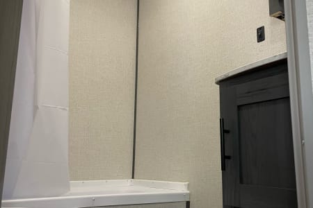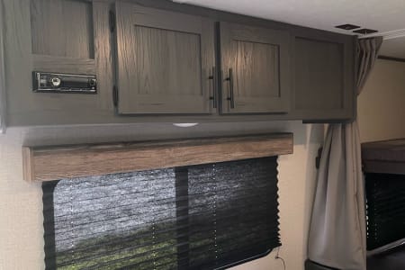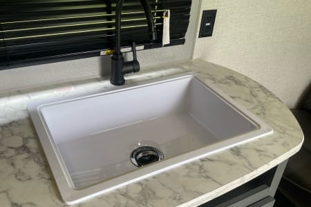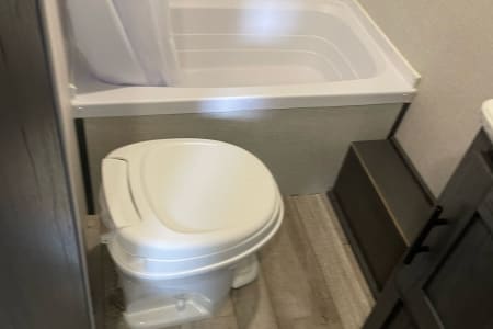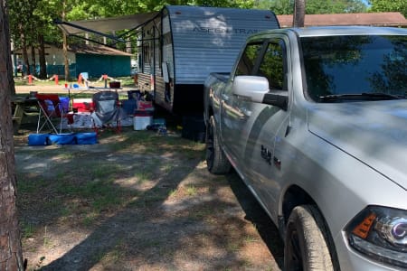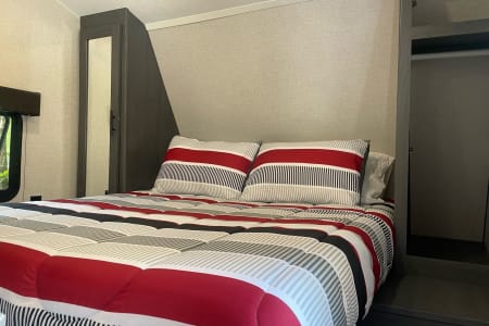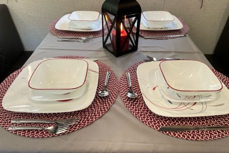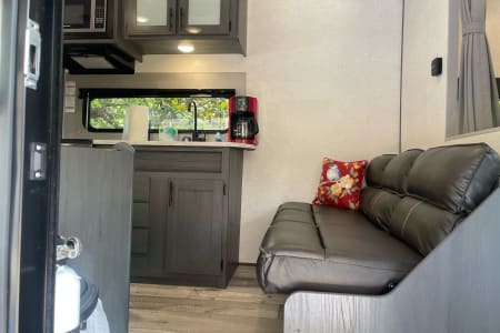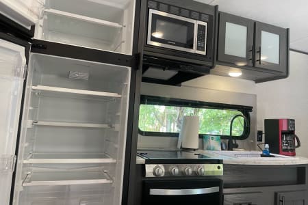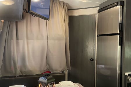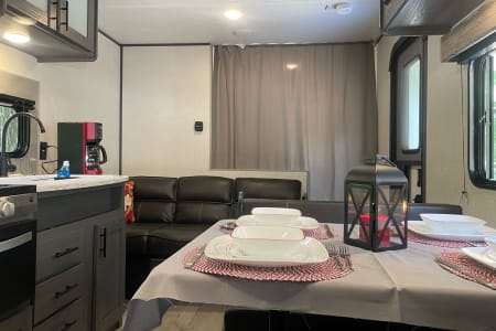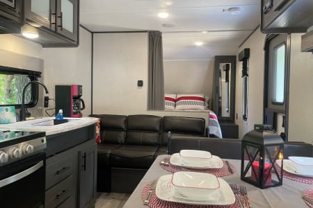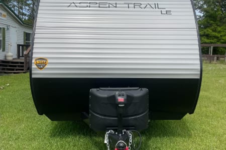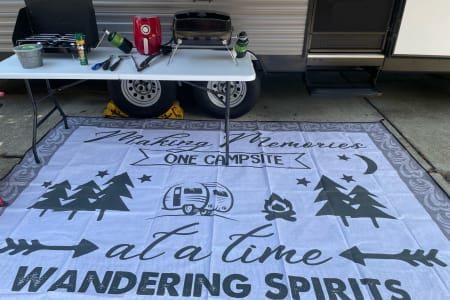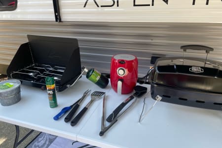 This cozy camper comes with everything you should need to enjoy the great outdoors. All necessary linens, flatware, cleaning supplies, toaster, small air fryer, 5 cup coffee pot with mugs, glass ware, plates for inside and plastic for outside. Outdoor supplies include(camping chairs, portable gas grill and portable gas cook top with gas, rug, table all camper hook ups, leveling blocks, etc )heavy duty tow hitch with stabilizers.