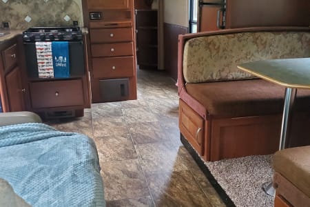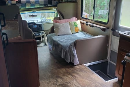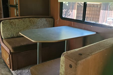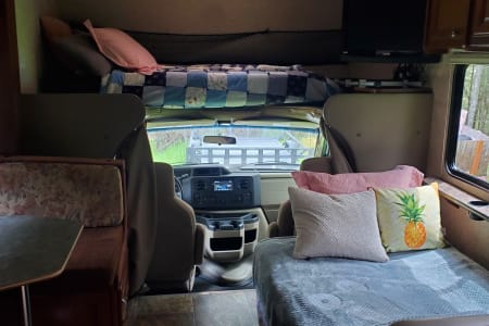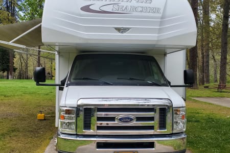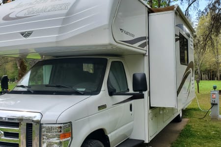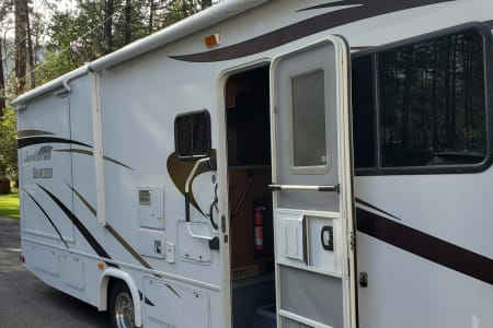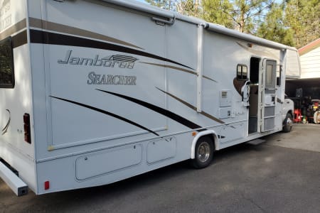 This 32ft Jamboree Searcher drives amazing and has only 72k miles. The RV is serviced regularly, up to date with new tires, batteries, and all systems working properly. Perfect for first time or experienced drivers. Back up camera included for easy maneuvering. There is 2 slide outs where the kitchen table is and the master bed to make the living space even bigger. Fully equipped with all hookups, private master bedroom with a queen bed and tv/dvd, dinette conversion (full), small kid sized sofa bed, a large bunk over cab with a queen mattress and tv/dvd, fridge, freezer, microwave, propane stove, oven, heater, air-conditioning, large bathroom and shower. All kitchen appliances, coffee pot, linen/pillows for 4 beds, and towels provided. 4 camping chairs included as well. Ready to hop in and adventure! There is ample storage in locked compartments on the outside and inside the kitchen table seats. Located in Southern Oregon with endless Rv exploring around. Good for local or long distance trips. Pets welcome! Capable of towing. Street parking available for your vehicle at pickup! 30 mile uber ride from Medford airport. NO BURNING MAN ALLOWED. Pick up time is 3pm, drop off time is 11am. Flexible if there are no other bookings that day and prior arrangements are made with me. Contact me with any questions!