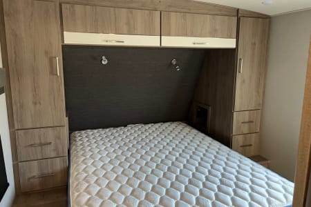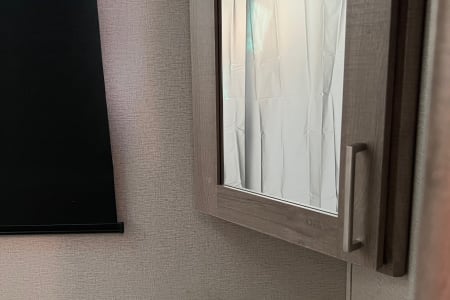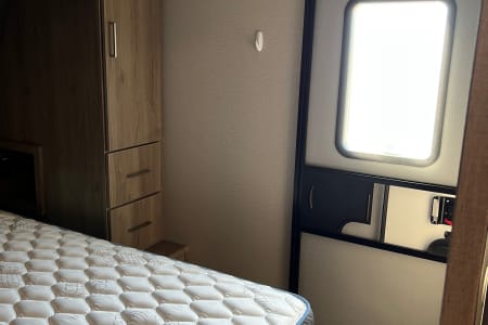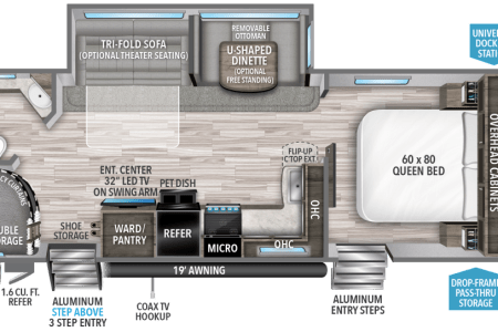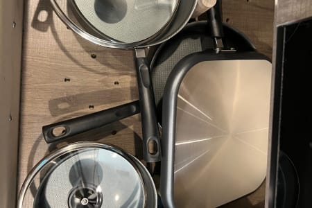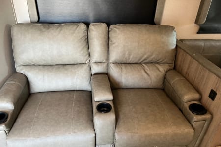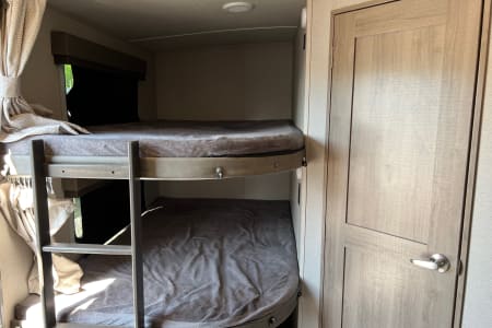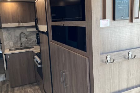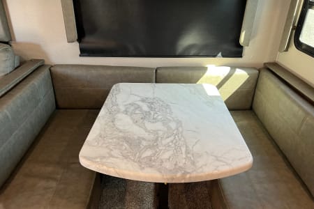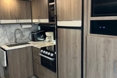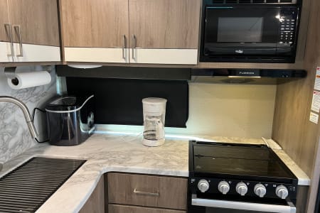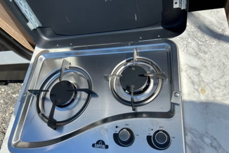 You have an outdoor grill set and a large 19' awning to help cover while you are cooking outside from the sun or the rain. There is extra counterspace for cooking as well in the kitchen. We equipped this trailer with a toaster, coffee maker, and ice maker as well.