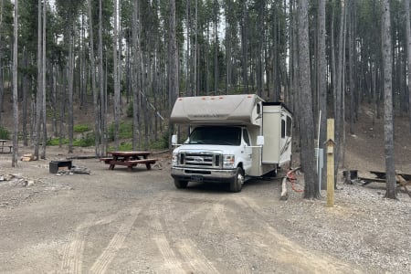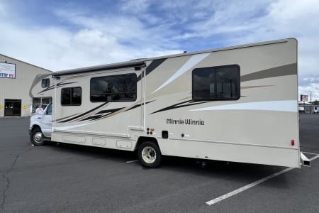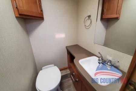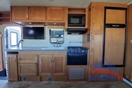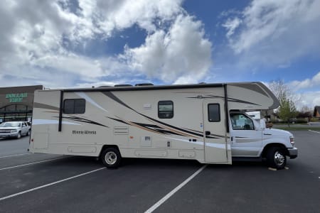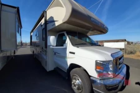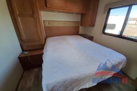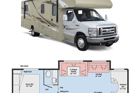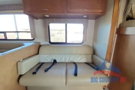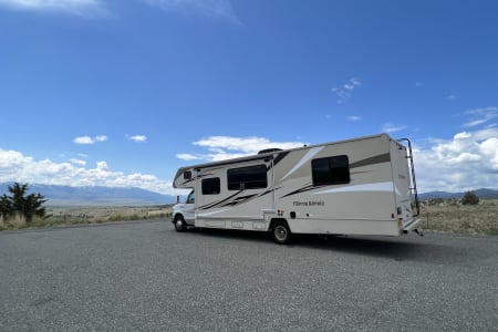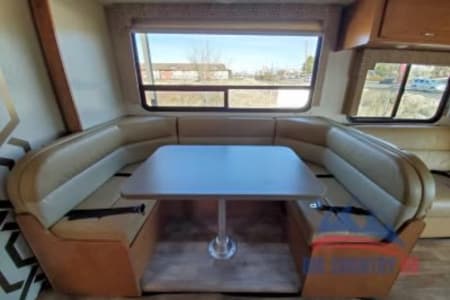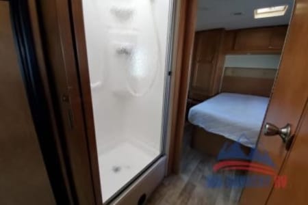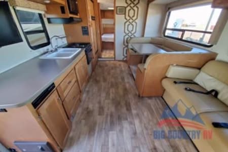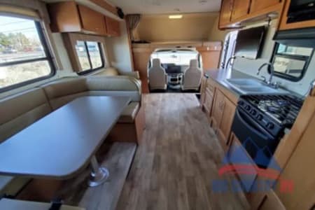 Great RV with plenty of room and counter space. Also has a north to south facing bed in back. (No Side ways bed) Also sleeps 8-10 people plenty of beds to go around. Also the bathroom is a good size with good counter space. Its also big even with out the pop out engaged. Also, when someone is driving the inside doesn’t bounce that much. I’ve rented rvs in the past and it was super bumpy, so that’s nice.