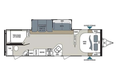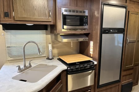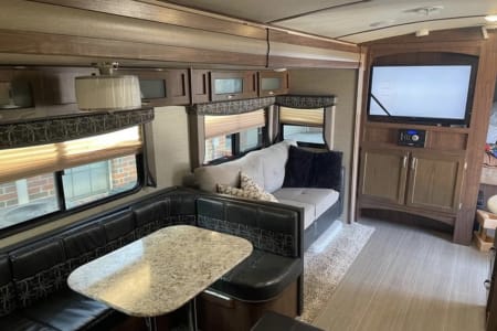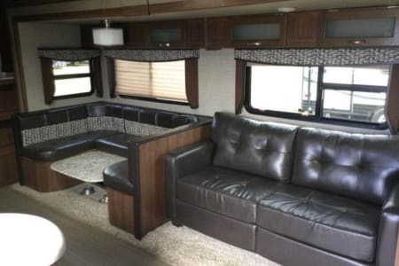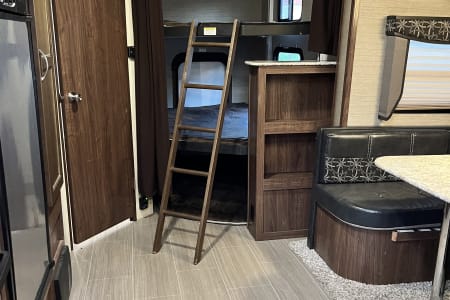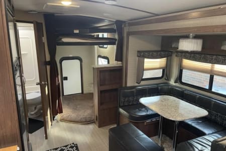 This is super family friendly! Delivery ONLY- we set up for you! King bed in front bedroom, Couch makes into a queen bed, table makes into an additional bed. There is also a set of triple bunks (full size) that are on a power-lift system (300 lb limit). FYI- Bottom bunk is basically a mattress on the floor though. Could sleep 9-11 depending on kids sizes etc. but comfortably 6-8. Power awning, auto jack leveling system. Fridge, microwave, stove, oven. 50 amp service. Dual ACs, heat. Bluetooth speakers playing indoors or outdoors, TV.