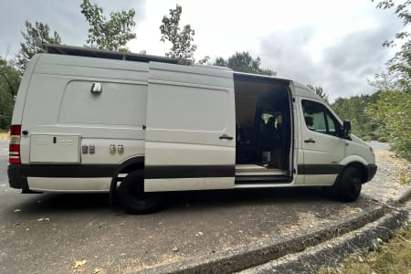 This cozy and custom built 2010 Freightliner 170 Ext Sprinter 3500 Dually features warm wood accents, butcher block counter tops, a full-size sink, and lots of cabinet space! Pull out full and twin beds, + optional inclusion of a pack-n-play or dog bed leaves plenty of sleeping and cuddle space for the whole family. Comfortably sleeps 3 adults, but could easily sleep an additional kid or two!
