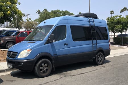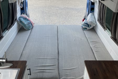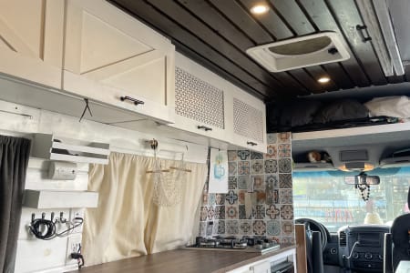 Murphy is a 2008, high top, 144” wheel base, 3.0 turbo diesel, passenger sprinter van. She has 200k miles, but runs great, having a new transmission, new brake lines, new brake calipers, new differential and a new battery and alternator. She’s a custom conversion camper van housing everything you’ll need in a boho style living space. With plenty of space for any toys you’ll want to bring with you, she also has all the essentials: a propane two burner stove, a large sink with normal and separate filtered drinking water, refrigerator, pantry, cassette toilet, and a king(wide, queen long) bed or bench couches.
