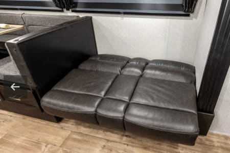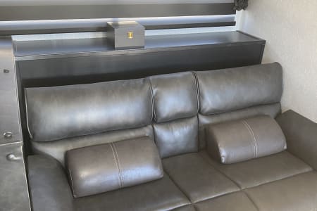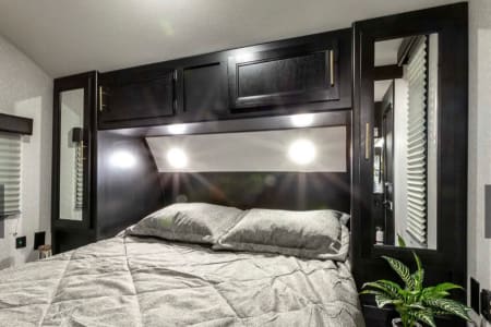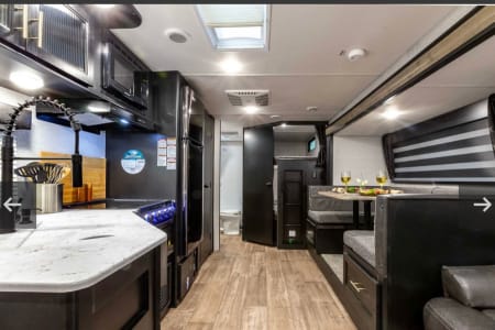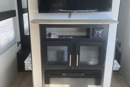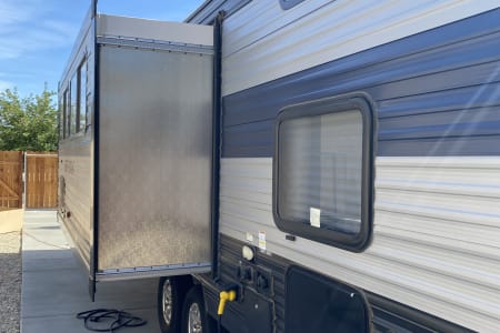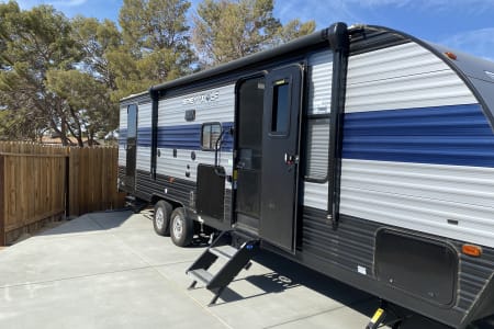 Precious is a brand new 2022 Forest River Cherokee that sleep up to 10 people. Precious features a powered awning with led lights to brighten your nights and keep you protected from the elements, easy to use stabilizing jacks, 3 burner stove top, microwave, large sink, a couch that folds into a small bed as well has a dinette that converts into a bed, and 2 rear bunks that can each easily fit an adult with room to spare. Built in speakers both inside and outside powered by a Bluetooth stereo, central AC and Heater controlled with a digital thermometer, a front private queen bedroom and a full bathroom with shower with a separate rear entry door for easy access.