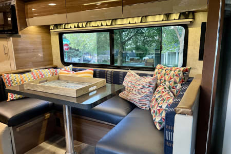 U-shaped dinette offers optimal living space and converts to full bed