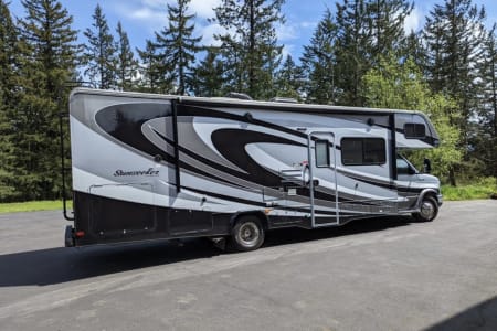 Can sleep up to 8 people (6 adults and 2 kids) with one queen bed, a full-size bunk over the cab with TV, a convertible dinette, and pull-out sofa.