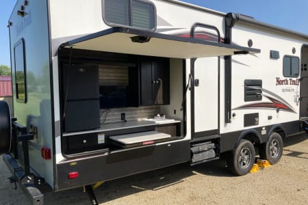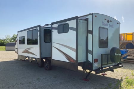 This is the ultimate family-friendly travel trailer for your family! From the double slide outs to the rear bunkhouse there is plenty of room for even a few extra guests when you choose to camp with this 2019 North Trail 33BUDS travel trailer! You will also enjoy the easy entrance into this model with two entry doors. The front door leads into the kitchen/living area and the rear door which leads into the half bathroom. Plan to spend more time outdoors since there is an outside kitchen plus a bumper mount grill where you can grill a few hamburgers or hot dogs for dinner.