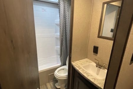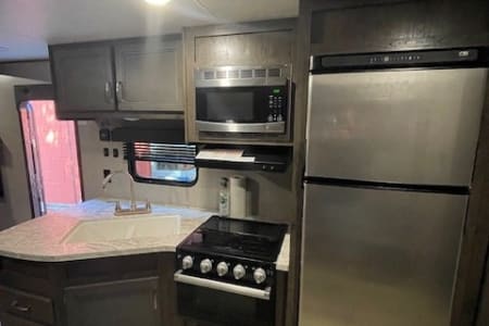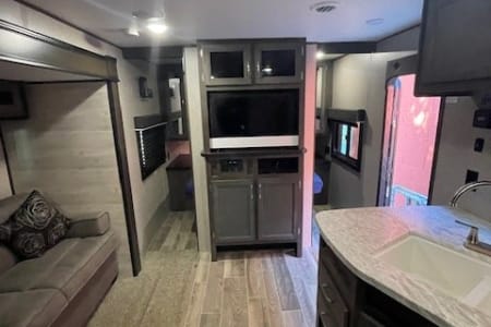 Brand new only used a few times. Beautiful Jayco Bunk House trailer with Queen Sleeper and full size bunks along with dinette sleeping and scissor sofa. Flat Screen TV, Bluetooth Stereo win side and outside speakers, Outside kitchen with cook top, refrigerator and sink for cleaning. Nice size shower/bathtub. Out door shower. LED lights on awning, with speakers on awning. Great set up and will fit in all campgrounds because OAL I