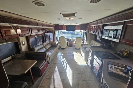 The RV is completely checked, cleaned and disinfected after each rental. It comes with full fuel, propane, all the amenities (coffee maker, dishes, utensils, paper towels, trash can, linens, towels), empty holding tanks, and in clean condition. Brand new steerer tires installed Mar 2025 and a fresh oil and filter change on the generator has this rig ready for safe, problem free driving and camping. The 2000-watt inverter and 4 house batteries will let you run basic 110v items without having to start up the generator.