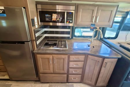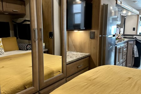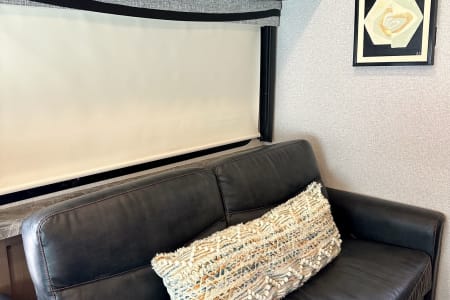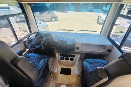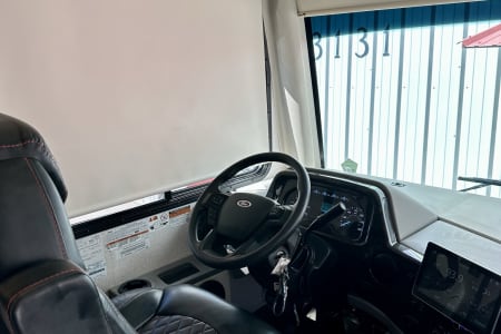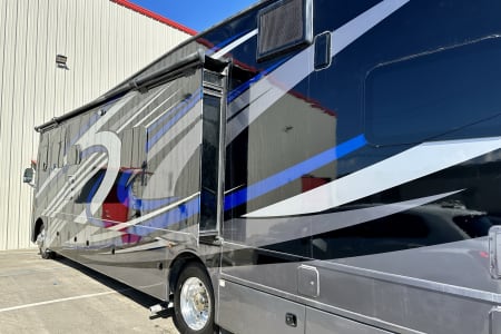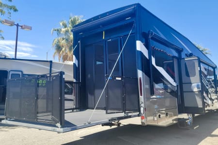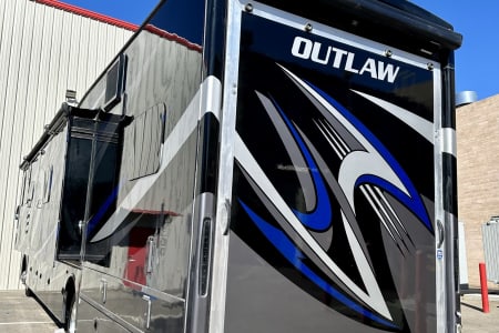 New features included in the 2023 motorhome include general décor and styling updates throughout the coach, all new floating radio design with navigation and USB charging locations, combination induction & gas cooktop, backlit Firefly entry switch plate, multiple USB charging stations throughout the coach. Options include the beautiful full body exterior, leatherette jackknife sofas in garage and frameless dual pane windows. The Outlaw toy hauler RV has an incredible list of standard features including beautiful wood & interior decor packages, 4 LED TVs, (3) A/C units, power patio awning with integrated LED lighting, 3 camera monitoring system, automatic leveling system, Soft Touch leather furniture, day/night shades and tinted windows.