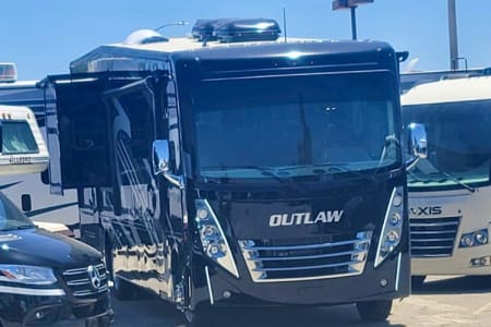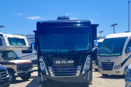 Brand new 2023 Thor Motor Coach Outlaw toy hauler, 38MB RV approximately 39 feet 9 inches in length with 2 slide-out rooms, Ford 26-Series chassis with Triton V-8 engine, high polished aluminum wheels, residential refrigerator, electric rear patio awning, bug screen curtain in the garage, roller shades on the driver & passenger windows, as well as drop down ramp door with spring assist & railing for patio use.