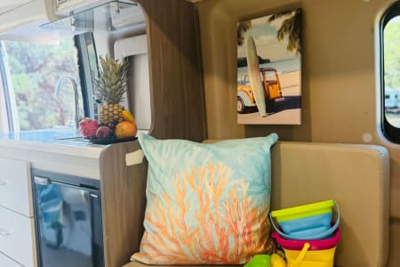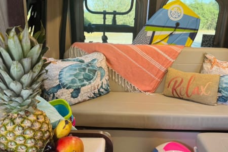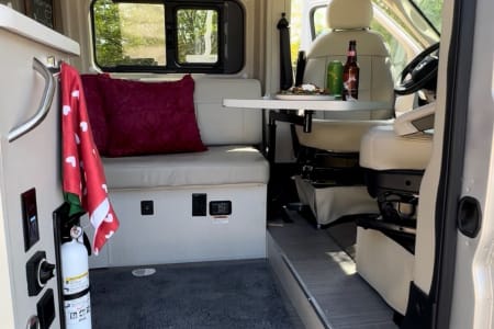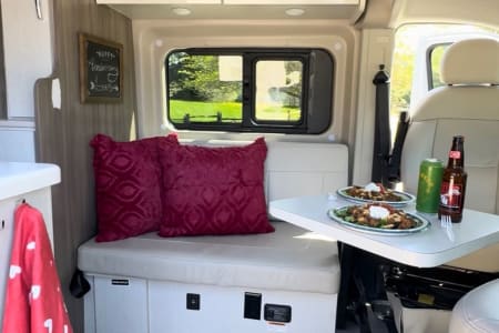 Seating is set up for 6 people to travel comfortably. Sleeping area is 1 large bed in the back for 1-2 people.