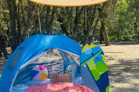 Screens in the back and side door bring all the vibes of tent camping in comfort. Also has AC if you prefer to keep the outside out! (Or a propane heater for colder temps).